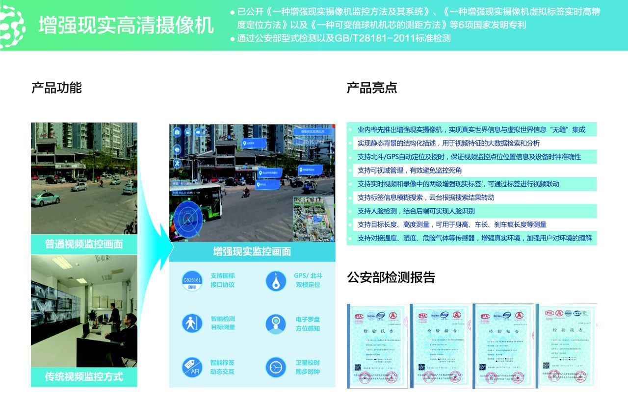 高新兴走在安防行业前沿,坚持自主研发,在业内率先提出并实现的增强现实高清监控技术。目前已制定增强现实国家标准,并且通过公安部型式检测以及GB/T28181-2011标准检测。高新兴研发中心产品市场部经理黄仝宇表示,高新兴将在2015深圳安博会隆重推出4K超高清视频结构化增强现实球机,可让参观者更直观看世界。从增强现实高清监控技术层面上讲,实现将实时视频的“现实”与虚拟的“增强”信息结合起来,使监控人员在实时监控画面上能够直观了解目标信息,可让背景信息结构化,这种背景信息转化为文本信息,可帮助监控人员快速根据背景信息进行搜索、快速定位,在实时监控画面中添加摄像机的经纬度、方位角,标注目标的名称、地址、联系方式等信息,帮助监控人员了解监控画面中的视频信息及时有效地处理视频画面中捕捉到的异常情况、突发事件,同时结合了智能分析技术,实现了人脸检测、目标测量的功能,可以将目标人的人脸部分图像进行提取并结合人脸对比识别系统进行目标识别,同时对目标人进行长度、高度的测量,可在公安实战中起到重大的作用。